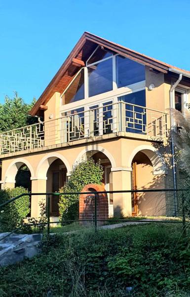Badacsonyban vált eladóvá ez a különleges atmoszférával rendelkező épület, mely egyedi kialakításával egyből kitűnik az őt körülölelő ingatlanok közül. A területről és a ház egészéből meseszép a panoráma a Balaton vizére, de ha ez nem lenne elég, a Badacsony is ott magasodik az épület mögött.A belterületi, 1519 négyzetméteres telken a jelenlegi tulajdonos tervei és álmai alapján készült el 2005-ben a hétvégi házként bejegyzett ingatlan – mely családi otthonnak is kitűnő választás lehet -. Az épület alapjául egy már meglévő bazaltkő pince szolgált, ez került átépítésre és bővítésre korszerű anyagok felhasználásával.A ház két szinten összesen 166 négyzetméternyi hasznos alapterülettel rendelkezik.A földszinten kialakított helyiségeket az előtérből közelíthetjük meg. Itt található egy 27 négyzetméteres, parasztfödémes, meghitt hálószoba, mely közvetlen kertkapcsolattal rendelkezik és akár két különálló hálóvá osztható. Mellette kapott helyet a lépcsőház, egy fürdőszoba, tároló, pince és egy műterem.Az emeleten lévő helyiségek közül a teljes üvegfelülettel ellátott nappali/műterem és a hozzá tartozó terasz olyan egyedi és megismételhetetlen hangulatot áraszt, hogy itt egyből az az érzése az embernek, hazaért...Ezt a nappali részt egészíti ki még egy közlekedő, hálószoba, fürdőszoba, konyha és étkező, valamint egy loggia is.Az épület mindkét szintjén beépítésre került egy-egy fatüzelésű kályha, így hűvösebb időszakban ezek szolgáltatják a meleget.A kert teljesen körbekerített, több autó egyidejű parkolása is megoldható telken belül.Az udvar teraszos kialakítású, akár egy medence, gyermek játszó vagy nyári konyha kiépítésére is bőven van még hely.Az épület melletti részen egy fedett, hangulatos kerti kiülő is helyet kapott, a kert alsó részén pedig egy téglából épült tárolót is építettek.A ház egész évben aszfaltos úton könnyen megközelíthető, a Balaton partjától gyalogosan 15 percre, a központtól 2 perces autóútra van.Ajánlom az ingatlant mindazok figyelmébe, akik a “béke szigetét” keresik távol a világ zajától. Az épület állandó lakhatásra és nyaralónak is egyaránt tökéletes választás lehet!Amennyiben kérdése merülne fel az épülettel kapcsolatban, vagy szeretné azt megtekinteni, kérem keressen megadott elérhetőségeim egyikén!
