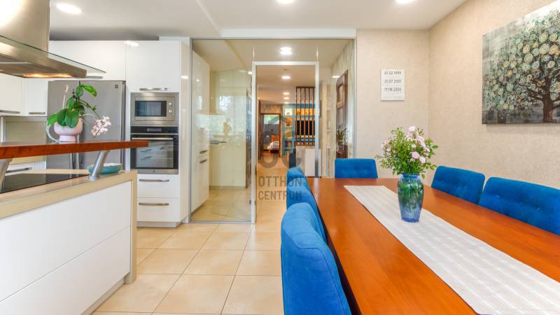 Fedezze fel ezt a kivételes lehetőséget, amely tökéletes választás lehet azok számára, akik egy tágas, kényelmes otthont keresnek Budapest 16. kerületében, Rákosszentmihály csendes és barátságos környezetében. 3 szintes ingatlan :•Pince szint (106 nm): 45 nm-es dupla állásos garázs biciklitárolóval, beépített gardrób, és egy 37 nm-es hobbiszoba, gépészeti helyiség, WC és zuhanyzó.•Földszint (90 nm): tágas 30 nm-es nappali, 20 nm-es konyha-étkező a hozzátartozó kamrával, vendég WC, 17 nm-es hálószoba fürdőszobával és gardróbbal.•Emeleti szint (80 nm): három hálószoba, amelyből kettő össze lett nyitva, de könnyedén visszaalakítható (12, 11 és 24 nm), valamint egy 9 nm-es fürdőszoba, 2 kisebb erkély és galéria.- alapterülete 276 nm- telek mérete 545 nm - földszint 90 nm, nappali, étkezős-konyha kamrával, hálószoba fürdő- és gardróbbal, vendég WC- emelet 80 nm, 3 szoba (kettő összenyitva 12 és 11) fürdőszoba, galéria és 2 db erkély- pince 106 nm, mely dupla beálls garászból, tároló, gardrób, hobbiszoba, gépészeti helyiség, WC és zuhanyzóból áll- terasz 19 nm- Enegetikai besorolása: A++- Napelem (5 kw)- Dupla garázs + parkolási lehetőség külön bejárati kapuval az udvarbanÍgy bőven elegendő helyet biztosít nagy családosok számára is. Az ingatlan kiváló állapotban miatt, ezért azonnal költözhető, így Önnek nem kell aggódnia a felújítások miatt. A két fürdőszoba kényelmet biztosít, különösen a reggeli rohanás idején, amikor fontos, hogy mindenki időben elindulhasson. A 19 nm-es terasz, valamint a 2 nm-es erkély tökéletes helyszínt kínál a pihenésre, ahol élvezheti a szabad levegőt és a gyönyörű panorámát, amely a környéket övezi. Rákosszentmihály egy rendkívül biztonságos és csendes városrész, ahol a szomszédok barátságosak, és a közvetlen környezet kedvező az aktív, családias életvitelhez. A környék kiváló közlekedési lehetőségekkel rendelkezik, így könnyen elérheti Budapest belvárosát autóval vagy tömegközlekedéssel.Az ingatlan nemcsak otthonául szolgálhat, hanem értékálló befektetésként is megállja a helyét, hiszen a környék folyamatosan fejlődik és bővül. Ha Ön is szeretne egy olyan ingatlanra szert tenni, amely minden szempontból megfelel az elvárásainak, ne habozzon kapcsolatba lépni velünk. Szívesen válaszolunk kérdéseire, és segítünk Önnek abban, hogy megtalálja álmai otthonát vagy befektetési lehetőségét a hét bármely napján. A bizalom és a szakértelem a mi mottónk, és mindent megteszünk annak érdekében, hogy Ön elégedett legyen választásával.Ez az ingatlan a \"Felező csomag\" megbízási portfólióhoz tartozik. Részletek az Otthon Centrum weboldalán.