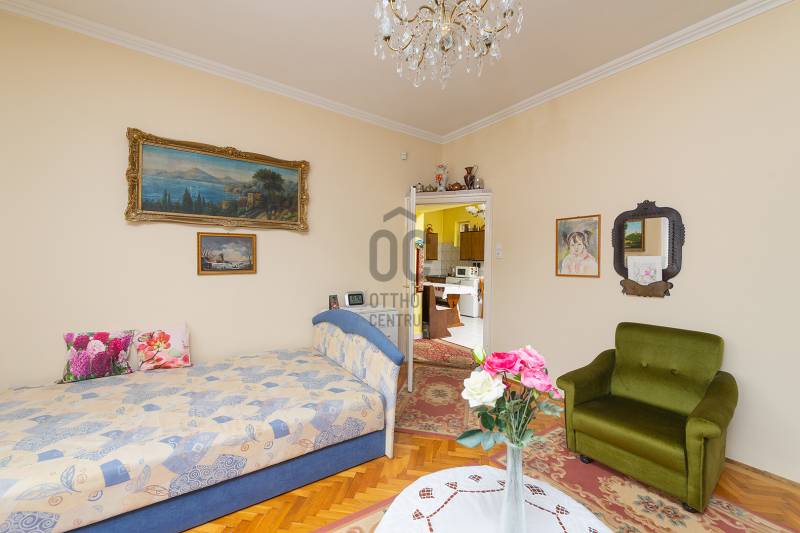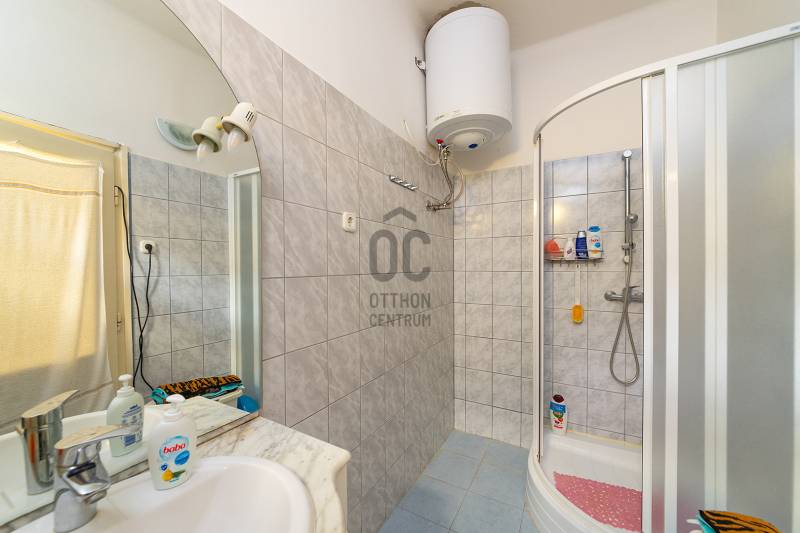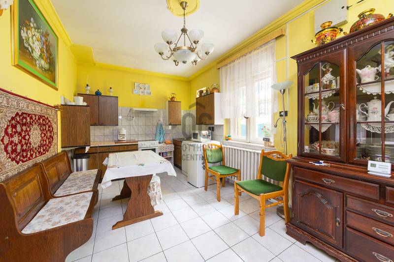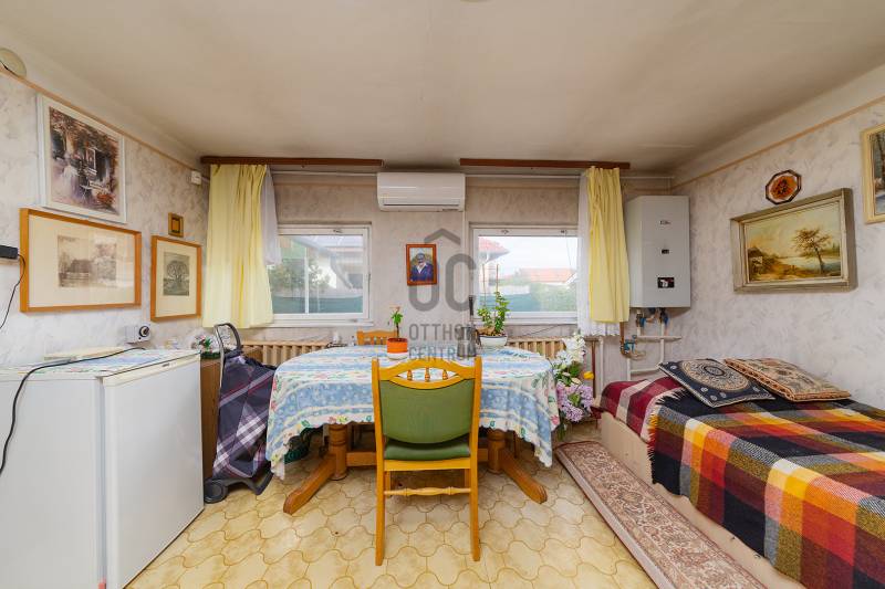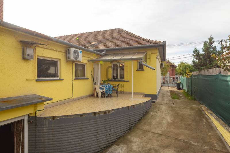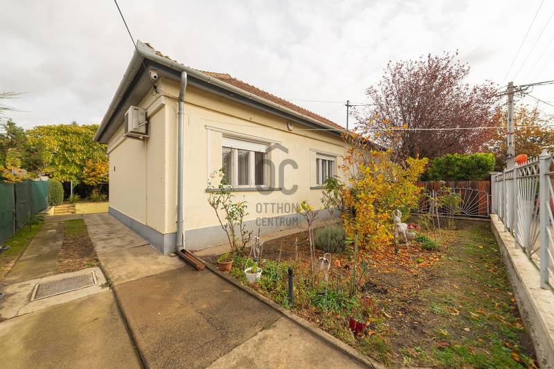 XVIII. kerületben a Béke tér környékén csendes mellékutcában, de kiváló közlekedéssel kínálunk megvásárlásra egy földszintes kialakítású ikerház felet. Klasszikus ikerház, a telek középen kerítéssel elválasztva, önálló utcai bejárat mindkét ikerfél lakói számára. A ház tégla építésű, cserép fedéses, belső elosztása tágas és kényelmes. A fedett teraszról nyílik a bejárat, egy jó méretű előszobából jutunk be a nagy méretű konyha-étkezőbe, innen két déli tájolású, világos szobát találunk, továbbá egy jó állapotú fürdőszoba, egy külön mellékhelyiség és egy belső lépcsőház is helyet kapott, innen közvetlenül juthatunk le a szuterén szinten lévő nagy garázsba. A házban kialakításra került még két szoba. A fűtést gázcirkó biztosítja, nyáron a kellemes hőmérsékletről klíma gondoskodik. A telek 303 nm, csatorna utcáról beköthető (a tulajdonosok elkezdték a hivatalos ügyintézést, folyamatban van a bekötés, ami több hónap is lehet). Telken belül több autóval is parkolhatunk, a garázsban további egy autó elfér, illetve van hely tárolásra is. A ház mögött egy kerti tároló is kialakításra került szerszámoknak, sporteszközöknek. Az utcai kapu elektromos. Csendes, családi házas mellékutca, a közelben (6 perc séta) több buszmegálló is megtalálható: 166, 236, 266, vonatállomás 5 perc séta, iskola, bevásárlási lehetőség, posta 5-10 percen belül gyalogosan elérhetők. Az ingatlan jogi háttere rendezett, rövid időn belül birtokba vehető.