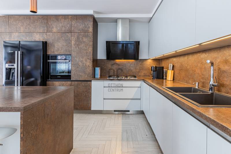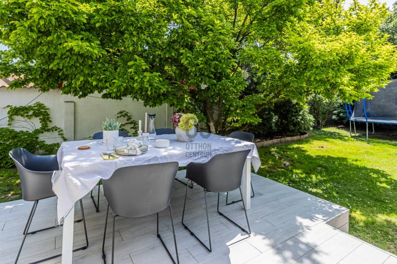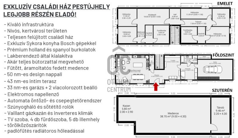 A XV. kerület NÍVÓS, KERTVÁROSI részén vált eladóvá ez az ÖNÁLLÓ CSALÁDI HÁZ, EXTRÁN KIEMELT helyen.Az utca CSENDES, BIZTONSÁGOS, a szomszédok kedvesek.Az ingatlan KIEMELT MINŐSÉGGEL és MŰSZAKI TARTALOMMAL lett kivitelezve, minden igényt kielégít.Ez a szépség 2000 körül épült, néhány éve TELJESEN FEL LETT ÚJÍTVA, nem csak ESZTÉTIKUS, hanem PRAKTIKUS és KÉNYELMES is lett.A 3 SZINTEN 3 nappalit, 6 szobát, 4 fürdőszobát és 5 illemhelyet kapott, TÁGAS és VILÁGOS TEREKET, NAGY ABLAKOKAT és rengeteg EXTRÁT.Az ingatlan egyik KÜLÖNLEGESSÉGE a csodálatos NAPPALI az ELEGÁNS SYKORA KONYHÁVAL, amit a hatalmas üvegtáblás teraszajtókkal egybe lehet nyitni a GYÖNYÖRŰ TERASSZAL és a GONDOZOTT KERTTEL.A FÖLDSZINT és az EMELET MODERN ÉS JÓL FELSZERELT lakótérként funkcionál, a SZUTERÉN szinten pedig kialakítottak egy WELLNESS RÉSZT: FEDETT, FŰTÖTT, ÁRAMOLTATÓS MEDENCÉT zuhanyzóval, szauna előkészítéssel és közvetlen kijárással a teraszra.A jelenlegi tulajdonos LAKBERENDEZŐ, így a PRÉMIUM BURKOLATOK és a KÜLÖNLEGES BERENDEZÉS is kiváló ízléssel és hozzáértéssel lett összeválogatva. Az új tulajdonos igény és megegyezés szerint a BERENDEZÉS ELEMEI közül is válogathat.EXTRÁK A HÁZBAN:- Lakberendező által tervezett exkluzív Sykora konyha plafonig beépítve- Rugós, csapódásgátlós előlapok- Kétajtós, jégkocka és jégkása készítő, vízszűrős hűtő- Bosch konyhagépek- 2 db beépített mosogatógép- Gránit mosogató- 50 nm-es design nappali- 6 db hálószoba- TV szoba- 4 db fürdőszoba és 5 db illemhely- Plafonig csempézett fürdőszobák- GardróbokEXTRÁK A KERTBEN:- 32 nm-es intim terasz- Elektromos napellenző- Automata öntözőrendszer- Csepegtetőrendszer- 2 db kerti csap- 33 nm garázs- 2 db viacolorozott zárt autóbeállóEXTRÁK A WELLNESS RÉSZBEN:- Fűthető és ellenáramoltatós medence- Futópad, edzőgépek- Tároló- MosókonyhaEXTRÁK MŰSZAKILAG:- Padlófűtés és radiátorok- Vaillant gázkazán- Hűtő-fűtő klíma minden szobában- Prémium burkolatok: holland melegburkolat, spanyol csempék- Hansgrohe csaptelepek- Törölközőszárítók- Földszinti ablakokon biztonsági rács- Szúnyoghálók- Sötétítő rolók- Márvány párkányA helyszínen további érdekességeket fedezhet fel.Az épület SZIGETELT, a fenntartási KÖLTSÉGE meglepően ALACSONY: a TELJES REZSI a leghidegebb téli hónapban mindössze 98 ezer forint volt!KIVÁLÓ AZ INFRASTRUKTÚRA:Posta, gyógyszertár, bölcsőde, óvoda és általános iskola 10 perces séta távolságra.Bevásárlási lehetőségek könnyen elérhetők, többek között Pólus Center, Aldi, Lidl, Spar.A belváros autóval 10 percre van.Az ingatlan per-, igény- és TEHERMENTES és megállapodás szerint költözhető.Jó választás mind MINŐSÉG, mind LOKÁCIÓ szempontjából.Családjának keres EXKLUZÍV OTTHONT, KIEMELTEN JÓ HELYEN?Hívjon bizalommal a hét bármely napján!Ez az ingatlan a \"Felező csomag\" megbízási portfólióhoz tartozik. Részletek az Otthon Centrum weboldalán.