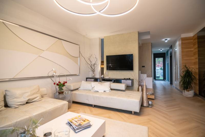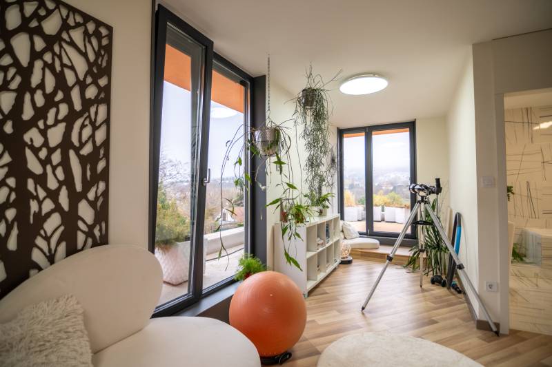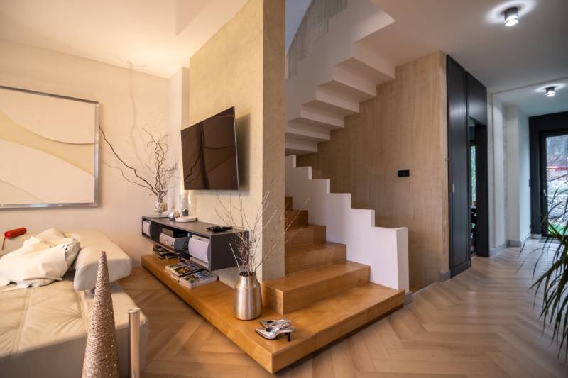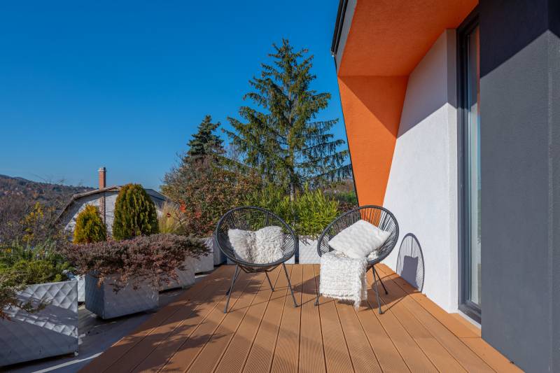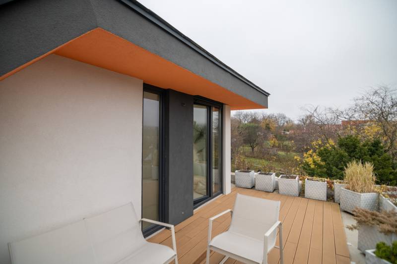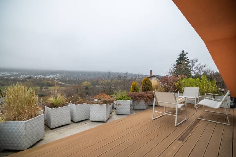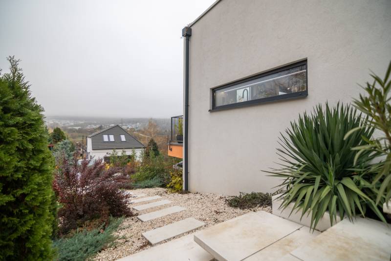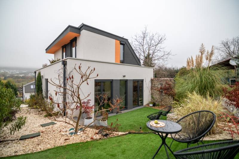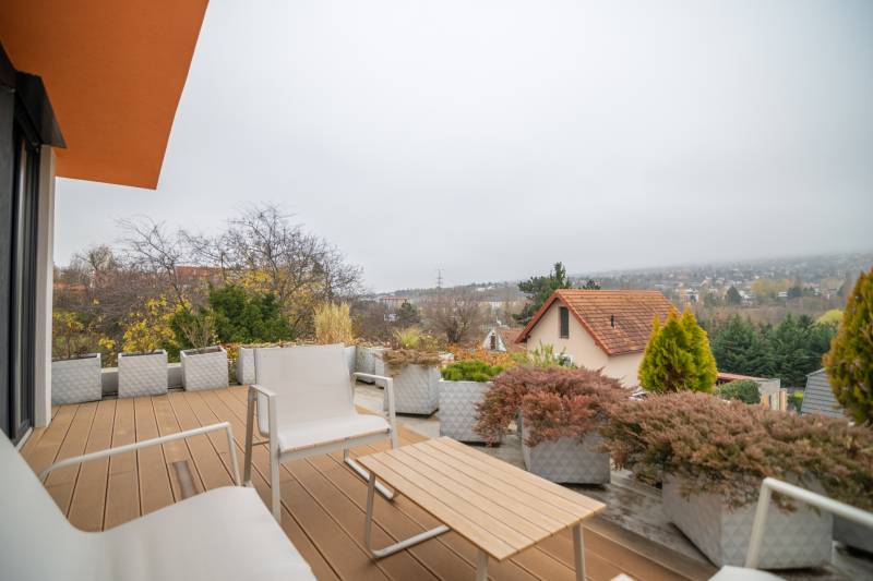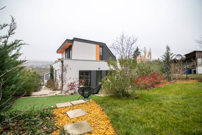 A III. kerület csendes, zöldövezeti részén, Ürömhegyen kínálunk eladásra egy minden részletében átgondolt, egyedi tervezésű otthont. A modern építészet és a természetközeli életstílus tökéletes harmóniában találkozik ebben a házban, amelyet kiemelkedő szakmai referenciákkal rendelkező belsőépítész alkotott meg.Az ingatlan nettó mérete 131,04 m² + 90 m² garázsszint + 5 m² erkély + 28 m² tetőterasz.A ház egy rézsűs telek felső részén áll, így a panoráma és a fény egyszerre része a mindennapoknak. A letisztult formák, természetes anyagok és a napfényes terek elegáns, mégis otthonos hangulatot teremtenek.FŐBB JELLEMZŐK- Prokoncept építési rendszer, német fa szerkezeti elemek- A+ energetikai besorolás, levegő-víz hőszivattyús rendszer- Padlófűtés, mennyezethűtés-fűtés, hővisszanyerős szellőztetés előkészítve- Rehau nyílászárók, mindenhol motoros redőnyök- 20 millió Ft értékű egyedi konyha és beépített bútorzat- Beépített gépek: AEG főzőlap, Whirlpool sütő és mikro, Gorenje hűtő- Klarstein elszívó, fekete csaptelepek, screenüvegek a vizes helyiségekben- Jacuzzi-előkészítés a panorámás tetőteraszon- 2 autós garázs, elektromos töltő és napelem-előkészítésKERT ÉS KÜLSŐ TEREKA ház körül kialakított, mintegy 400 nm-es kert a természetes anyagokra és a rendezettségre épül.A geotextíliás alapozás és a dísznövényeknek köszönhetően a kert szinte gondozásmentes, mégis élő, harmonikus zöldfelületet kínál.A teraszról a panoráma a főszereplő: az előtető véd az esőtől és a naptól, a csöpögő rendszer pedig automatikusan öntözi a növényeket.A tér kialakítása lehetővé teszi jacuzzi vagy kisebb medence elhelyezését is – a nyugalom és a kényelem kompromisszumok nélkül adott.LOKÁCIÓ ÉS KÖZLEKEDÉS- 218-as buszmegálló pár lépésre található, közvetlen kapcsolatot biztosít Óbudával (Szentlélek tér).- Az Aranyvölgy vasútállomás 5 perc sétára elérhető, ahonnan a Nyugati pályaudvar 15 perc alatt megközelíthető.- Autóval az Árpád híd 15 perc alatt elérhető, a Bécsi úti bevásárlóközpontok (Tesco, Aldi, Praktiker, Decathlon) pedig mindössze néhány percre találhatók.A környék infrastruktúrája fejlett: iskola, óvoda, gyógyszertár, kisboltok és sportlehetőségek is könnyen elérhetők. A Csillaghegyi strandfürdő és uszoda autóval néhány perc, akárcsak a közeli túraútvonalak és kilátópontok.Földszint:Tágas, 42 nm-es nappali–konyha–étkező nagy üvegfelületekkel és dél-nyugati tájolással.Teljesen gépesített, beépített konyha étkezőpulttal kombinált főzőszigettel.Két külön nyíló, kertkapcsolatos hálószoba és zuhanyzós fürdő vendég-WC-vel.A nappaliból közvetlen kijárat az árnyékos teraszra és a gabion zuhanyfallal kialakított pihenőkertbe.Emelet:Világos, egybenyitott tér, amely igény szerint master bedroom + gardróbként is kialakítható.Külön fürdőszoba háztartási funkcióval és tárolókkal.A 28 nm-es panorámás tetőteraszról a Hármashatár-hegy látványa tárul elénk, jacuzzi-előkészítéssel.Garázsszint / Gépészet:Kétállásos garázs, automata kapuval.Szauna, kondiszoba vagy tároló kialakítására alkalmas hátsó tér.Hőszivattyús padló- és mennyezeti hűtés-fűtés, előkészített napelem és elektromos autótöltő csatlakozás.Ez az otthon azoknak szól, akik értékelik a modern építészet időtálló formavilágát, a természetes fényt, és a letisztult, gondosan megtervezett tereket.Ürömhegy egyik legszebb pontján található, ahol a panoráma, a nyugalom és a minőség valódi értékké válik.Amennyiben felkeltette az érdeklődését ez minden részletében művészien kidolgozott ingatlan, kérem keressen bizalommal!Díjmentes, bankfüggetlen hiteltanácsadással támogatjuk vevő ügyfeleinket a számukra legelőnyösebb finanszírozási döntések meghozatalában.Opcionálisan igénybe vehető kiegészítő szolgáltatásainkkal – mint ügyvédi közreműködés, energetikai tanúsítvány vagy villamos biztonsági felülvizsgálat – teljes körű szakmai támogatást nyújtunk az adásvétel folyamatának minden egyes lépésénél.