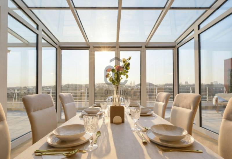 Penthouse a Szent István park felett – Margitsziget-panoráma, 50 m²-es tetőterasz, luxus Újlipótváros szívébenA 110 m²-es, belsőépítész által megálmodott otthon a kifinomult dizájn és a mindennapi kényelem kiegyensúlyozott elegyét kínálja. A lakás szíve az üvegfalú télikert-étkező, ahol télen-nyáron természetes fényben élvezheti a Dunára és a budai hegyekre nyíló kilátást.A tágas belső terek mellett hatalmas privát tetőterasz várja kültéri zuhannyal – ideális hely a város feletti pihenéshez. A lakásban 2 hálószoba, 2 fürdőszoba és egy nagy méretű nappali található, és válogatott prémium bútorokkal berendezett és gépesített. (A bútorok egy része a fotókon még nem látható.)– 110m² lakótér klimatizált üvegfalú télikert-étkezővel, 50m²-es tetőterasszal– Elsőrangú lokáció Újlipótvárosban a Pozsonyi út és a Szent István park mellett – Villamos: 4/6, trolibusz:75, 76, nem messze M3-as Metró, Nyugati Pu.-tol.– Örök panoráma a Szent István Parkra, a Margitszigetre és a budai hegyekre– Lifttel megközelíthető csendes legfelső szint - kerekesszékes használatra alkalmas– Prémium gépesítés, okostévé, okostelefonról vezérelhető klimatizálás és világítás– Távfelügyeletbe kötött riasztó, korszerű nyitás- és füstérzékelés– Parkolás közeli garázsban (bérlet része)– Otthonmenedzsment-asszisztencia (pl. tetőterasz ápolása) a bérlet része – takarítás igény szerintEz az ingatlan több mint lakás – életforma azoknak, akiknek fontos a tetőterasz és a télikert nyújtotta hangulat és a dunai horizont zavartalan látványa.Bérleti feltételekSzerződéskötéskor 2 havi kaució és 1 havi bérleti díj fizetendő.Minimum bérleti idő: 2026 július 31-igNemdohányzó ingatlan; szabadon mozgó kisállat nem hozhatóKözjegyzői okiratba foglalt kiköltözési nyilatkozatFelhívjuk figyelmét, hogy a képgaléria a lakás bútorozás előtti és utáni, berendezett állapotát is bemutatja, így a felvételek között eltérések tapasztalhatóak.