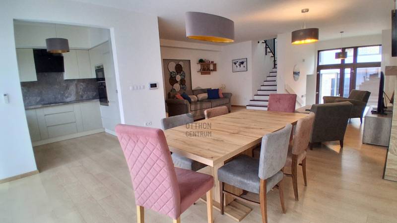 Debrecenben, Nagyerdő alján található ez a kiváló állapotú ikerház, amely minden igényt kielégít, legyen szó magáncélú lakhatásról vagy befektetési lehetőségről.Eladó-Kiadó ingatlan!!!!!Az ikerház egyedi tervezésének köszönhetően minden részlete a modern életstílust tükrözi, ideális választás azok számára, akik az exkluzív és világos otthonokat kedvelik. 2019-ben épült, alapterülete 240 nm, mely tágas tereivel és modern kialakításával azonnal magával ragadja a látogatót. 3 szinten helyezkednek el a ház helyiségei:PINCE SZINT:-előtér 13,6nm-gépészeti helyiség 8,95nm-nappaliként funkcionáló, s egyben konyhai részt is magában foglaló tér 49,2nm-mosó-konyha 4,13nm-szauna szoba 5,4nm-wc -kézmosó 1,8nm-kamra 2nm FÖLDSZINT:-terasz 22nm-nappali, étkező 40nm-konyha 7nm -gépesített, full extrás-előtér 6nm-zuhany-wc 4,5nm-közlekedő 2,2nm-lépcsőfeljáró 2,4nm-garázs 15 nm-átrium 22 nmEMELETI SZINT:-dolgozó szoba 14,3nm-háló szoba 3 db (13,7-13,1-13,3 nm)-fürdőzoba 6,18nm-közlekedő 8,6nm-lépcsőfeljárat 7,7nm-zuhanyz-wc 4,95 Az ingatlan prémium kivitelezéssel készült, amely magában foglalja a beépített bútorokat és szekrényeket, a modern LED hangulatvilágítást, valamint a motoros redőnyöket. A ház fűtése hőszivattyús falfűtés és padlófűtés, falhűtéssel történik a klimatizálás.NAPELEMRENDSZER A HATÉKONY ÉS TAKARÉKOS KÖLTSÉGMINIMALIZÁSÁRA!!! A kandalló nemcsak melegséget, hanem egyedi hangulatot is kölcsönöz a nappalinak, amely a családi összejövetelek középpontja lehet. Az ingatlan okos otthon rendszerrel is rendelkezik, amely lehetővé teszi a különböző funkciók távoli vezérlését, így az otthon kényelmesebbé és biztonságosabbá válik. A környék ellátottsága kiváló, hiszen a közeli üzletek, éttermek és szolgáltatások mindössze néhány perc távolságra találhatók. A közlekedés is kitűnő, hiszen a város tömegközlekedési hálózata könnyen elérhető, így a város bármely pontja gyorsan megközelíthető.Az ingatlanhoz tartozik egy garázs is, amely egy autó számára biztosít helyet, valamint az elektromos autó töltés lehetősége is adott. Nyitott beállók száma 4 autónak jelent parkolási lehetőséget.A rendezett kert automata öntözőrendszerrel van felszerelve, így a zöld területek karbantartása könnyedén megoldott.A biztonságra is nagy hangsúlyt fektettek, hiszen a riasztórendszer és a videókaputelefon garantálja a nyugalmat. A ház tehermentes, így az új tulajdonos azonnal birtokba veheti. Bármilyen kérdése van az ingatlannal vagy a vásárlási folyamattal kapcsolatban, bizalommal keressen!Szívesen állok rendelkezésére, hogy segíthessek megtalálni álmai otthonát vagy befektetését!
