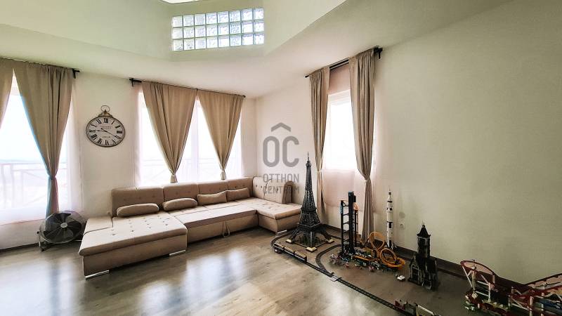 Eladó Csillaghegy legnagyobb és legkarakteresebb rezidenciája. Ez az ingatlan azoknak szól, akik nem érik be a tucatmegoldásokkal: texasi léptékű terek, zavartalan nyugalom és egy olyan panoráma várja, amit soha senki nem építhet el Ön elől.Amiért ez a birtok egyedülálló:Tökéletes Szeparáció és Nyugalom: Az ingatlan egy átmenő forgalomtól mentes, csendes zsákutcában található. Itt nincs zaj, csak a privát szféra és a biztonság.Elvehetetlen Örökpanoráma: A felső szintekről lélegzetelállító kilátás nyílik a környékre – ez a látvány minden nap ajándék.Rugalmas kialakítás, egybe is nyitható , de akár 6 lakás is kialakítható. Mivel a ház két telken helyezkedik el, így társasházzá alapítás is opció.Fent: Két hatalmas, felújított, modern lakás, különleges, átriumokkal, amik nagyvonalú tereket biztosítanak. Mind a két lakás a konyha-étkező valamint nappali mellett három hálószobával rendelkezik a felső szinten. A nagyobbik lakásnak alul még vendégszobája is van.Középen: 2 jó átlagos állapotú, teraszos nappali + 1 illetve nappali +2 hálós lakás, ideális önálló lakásnak, vendégeknek vagy irodának.Lent (Kertszint): További 2 lakás kialakítható, melyek közvetlen kertkapcsolattal rendelkeznek , de tökéletes wellness részlegnek vagy bérbeadásra, vállalkozásnak.Parkolás: A 3 garázs biztosítja a parkolást, de további beállók kialakítására is van lehetőség.Kinek ajánlom ezt a lehetőséget?Ez a „Dallas-stílusú” ingatlan páratlan választás nagycsaládosoknak, akik több generációt költöztetnének egy fedél alá, de kiváló befektetés is társasházasításra, vagy reprezentatív cégközpontnak/magánklinikának.